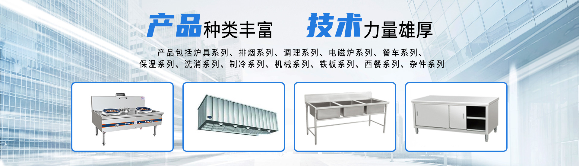 專供大型酒店、餐飲、部隊、機關、院校食堂等單位使用,產品質量均受到用戶的好評!本公司現有職員200余人,其中技術人員40人,廠區一萬多平方米,擁有優良的生產線;年生產能力可達上萬(套),所生產的廚房設備十多個系列三百多個品種,其中包括爐具系列、排煙系列、調理系列、電磁爐系列、餐車系列、保溫系列、洗消系列、制冷系列、機械系列、鐵板系列、西餐系列、雜件系列等。